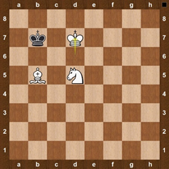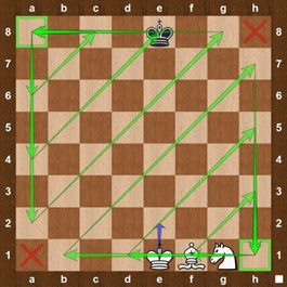 The first thing to note, is that we can only checkmate the King in the corner of the board which is the same color as our Bishop, which in this example is a8 and h1.
