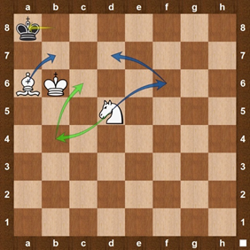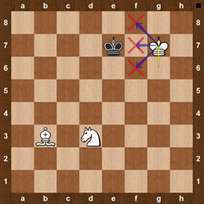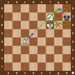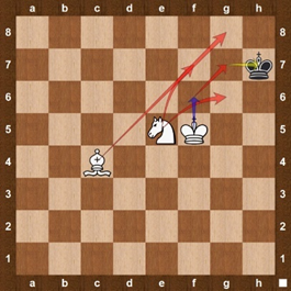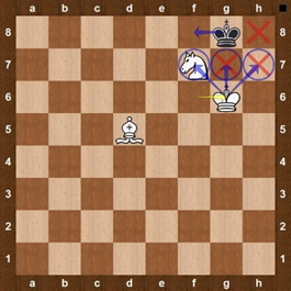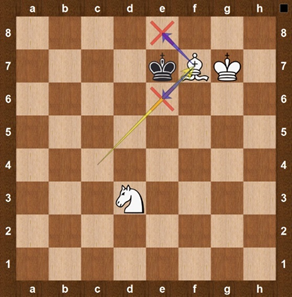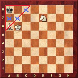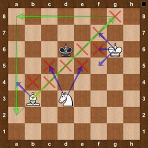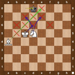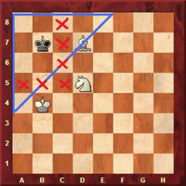 Black’s King cannot escape and only limited by 8 squares he can move at. Bishop is placed at its ideal square. Ideal square is on the diagonal (side of the Triangle), one square up: b3 or f7. The Knight is positioned on the ideal square also. The ideal square for the Knight is d3, it should be on the same row as the Bishop but one square apart. Why are these ideal squares? When Bishop and Knight are placed in its ideal way, they form a wall, preventing the black’s King from breaking through. Blue X’s show the squares controlled by white.