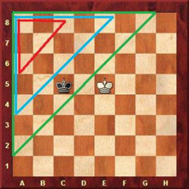 1. We divide the chess board onto three Triangles: Large Triangle, Medium Triangle and Small Triangle. These are represented in green, blue and red. On the diagram black’s King is inside the Large Triangle. As you already know the only way to checkmate the King is to force him into the light square a8 (or h8) if we have the light square Bishop. We move the opponent’s King from the Large Triangle to Medium and then to Small one, where checkmate will be delivered. See how in the game above.