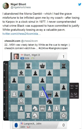 Earlier this year, Short faced the Smith–Morra in the Bangkok Open in his game against the US FM John Langreck. He won a beautiful miniature. (White should have played 8. 0-0 in that game, not 8. Qe2. (The queen is misplaced on e2 in the …Ng6 system.) And he had this to say on Twitter after the game: "I abandoned the Morra Gambit — which I had the grave misfortune to be inflicted upon me by my coach — after losing to Karpov in a clock simul in 1977. I never comprehended what crime Black was supposed to have committed to justify White gratuitously tossing away a valuable pawn." Yes, the Smith-Morra has commanded very little respect from chess pros. It appears very rarely if at all in top-flight chess. It is this that must have turned me away from the opening.