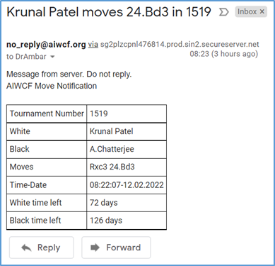There still remained one more worry: Our Email notifications contained the whole game in PGN with time stamps enclosed in braces. The content would look suspicious to both Google and the Ministry of Electronics, as non-chess savvy people might think of chess moves and time stamps as coded messages. This could trigger software to mark emails as Spam and the Ministry of Electronics to block our URLs. Accordingly, from 10th Feb 2022 we are now sending very short email notifications (see picture).