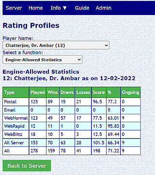 Under Actions → View results we provided a facility where a player can see his results month by month and the effect on his rating. However, the interface was for Engine-Allowed games only. We have now provided a drop-down to select either Engine Allowed or No Engine games.