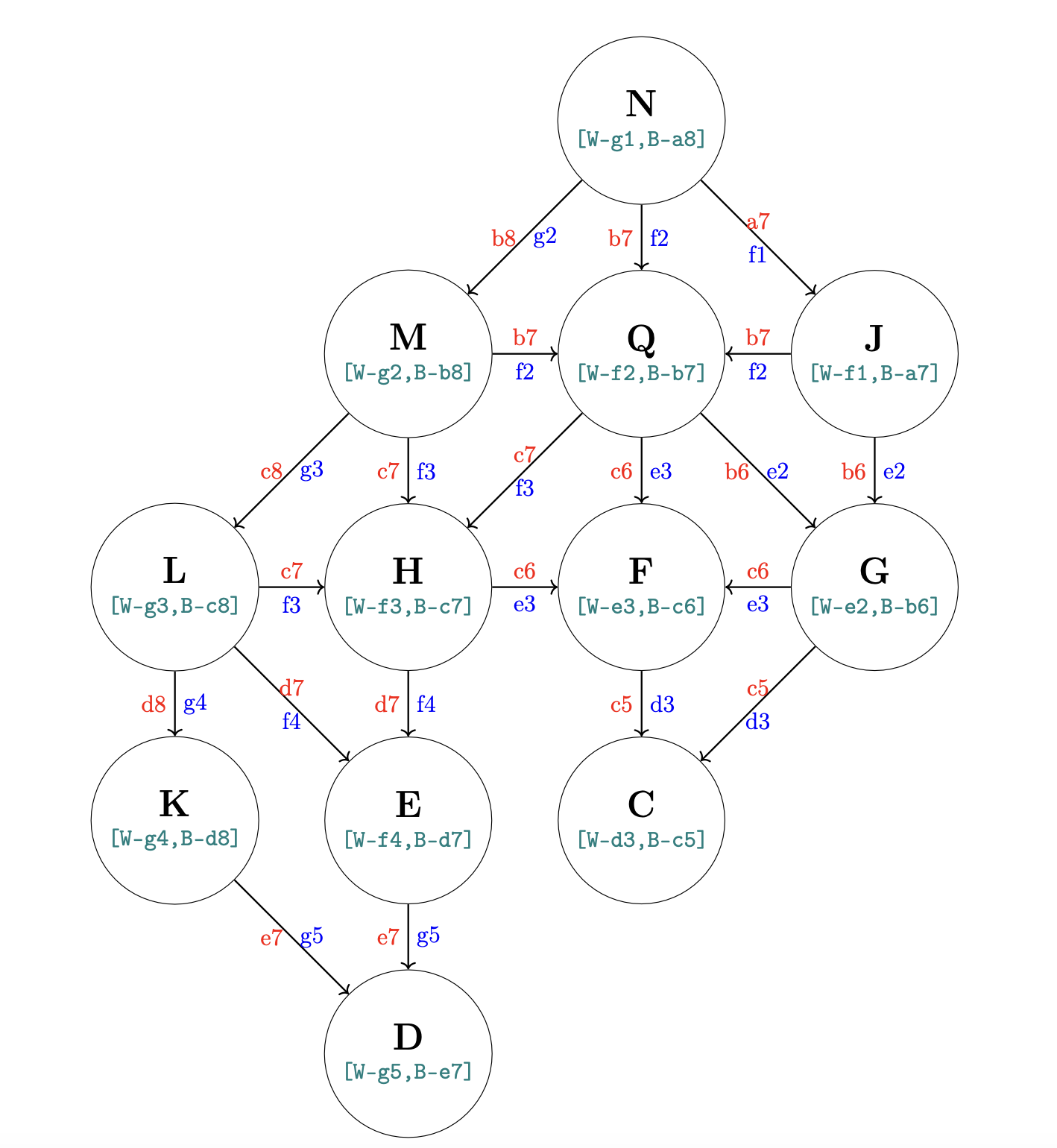 White plays 1. Kg1!! to reach N, then follows the acyclic directed graph given in the figure. Unsafe squares as per Table 1 are not explicitly listed.