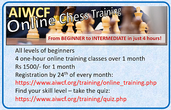 AIWCF has started conducting online training for beginners. If you are a beginner level player, first take the online quiz to determine your current level of skill and knowledge. Then register for online training for the month that you are free. The charges are Rs. 1500/-. There will be 4 online classes. You can select suitable dates/times as per your convenience.