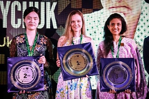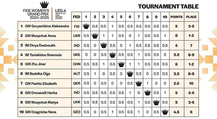 Anna Muzychuk emerged as the lucky winner of the Cyprus Women's Grand Prix, securing victory after a tense 9th and final round in which all games ended in draws. Both Anna Muzychuk and China's young prodigy Zhu Jiner scored solid 2600+ performances and tied for first on 6/9, leaving behind Harika Dronavalli, Aleksandra Goryachkina and Mariya Muzychuk at a one-point distance in the final standings. Harika came 3rd in tie-break.