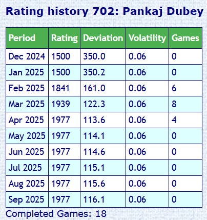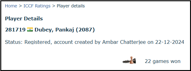 Took the course of AIWCF four lessons for a month which were extremely helpful. I would like another one on Chess 960.Pankaj Dubey took the AIWCF assessment quiz aiwcf.org/training/quiz.php in Jan 2025 and his Score was only 12 points out of 22. I rated him as an Absolute Beginner who is yet to make his ascent! He then enrolled for the AIWCF training course. He was an eager listener and during the course of 4 online lectures I was able to see that he was making good progress. I advised him to continue studying on his own in order to improve his chess playing skills. He then quickly rose up in both AIWCF and ICCF ratings we see from his progress charts.