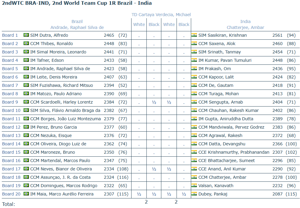 Similarly against Brazil, 4 games are drawn and the teams are level. Here is the cross table: