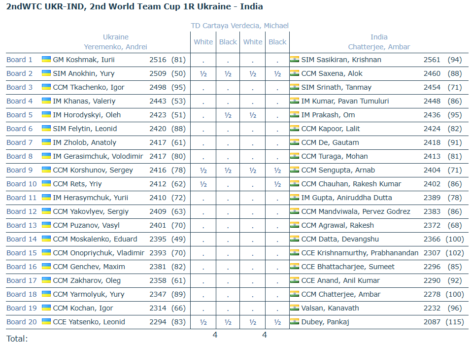 15th August 2025 and will go on upto 13th June 2026, but because of the Triple Block system, some players are really playing very fast. Within a space of just one month, Alok Saxena, Arnab Sengupta and Pankaj Dubey have completed both their games against Ukraine, while Om Prakash and R.K.Chauhan have finished one game. All these games were drawn so the score against Ukraine is level. Here is the cross table: